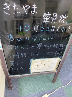 TOP ブログ一覧 10月22日(水)院長きたやま 10月22日(水)院長きたやま 投稿日:2025年10月22日 寒がりな私は今日のこの寒さが限界!仕事終わったら、こたつ布団買いに行こう。 ブログカテゴリー 院からのお知らせ アーカイブ 2025年 (212) 2024年 (234) 2023年 (231)