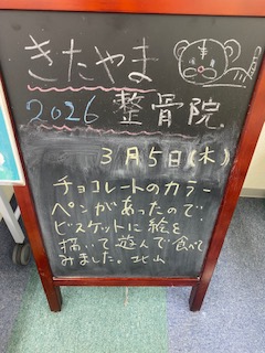 TOP ブログ一覧 3月5日(木)院長きたやま 3月5日(木)院長きたやま 投稿日:2026年3月06日 チョコレートのカラーペンがあったので、ビスケットに絵を描いて遊んで食べてみました。北山 ブログカテゴリー 院からのお知らせ アーカイブ 2026年 (36) 2025年 (237) 2024年 (234) 2023年 (231)
