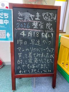 TOP ブログ一覧 4月18日(土)院長きたやま 4月18日(土)院長きたやま 投稿日:2026年4月23日 昨日、早速、ワークマンのリカバリーウェア買ってきてみましたが酔って寝落ちしてもたので効果がまだわかりません。北山 ブログカテゴリー 院からのお知らせ アーカイブ 2026年 (63) 2025年 (237) 2024年 (234) 2023年 (231)